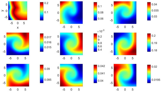 For set 1002, the results presented in Figure 3 and Figure 4 also correspond to a zero-velocity field, indicating that no spiral wave seems to be present; instead, the spatial distribution of u exhibits very small values for long periods of time, large curvature fronts as illustrated in the third and ninth frames, and very small curvature fronts, as shown in the sixth frame in Figure 3. However, the spatial distribution of v presented in Figure 4 indicates the presence of fronts of larger curvatures than those observed in Figure 3.