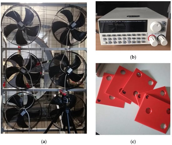 The laboratory stand: (a) fans’ array simulating wind; (b) programming DC electronic load; and (c) plastic wedge to change blade inclination.