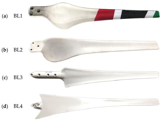 Rotor turbine blades with different shapes: (a) BL1; (b) BL2; (c) BL3; and (d) BL4.