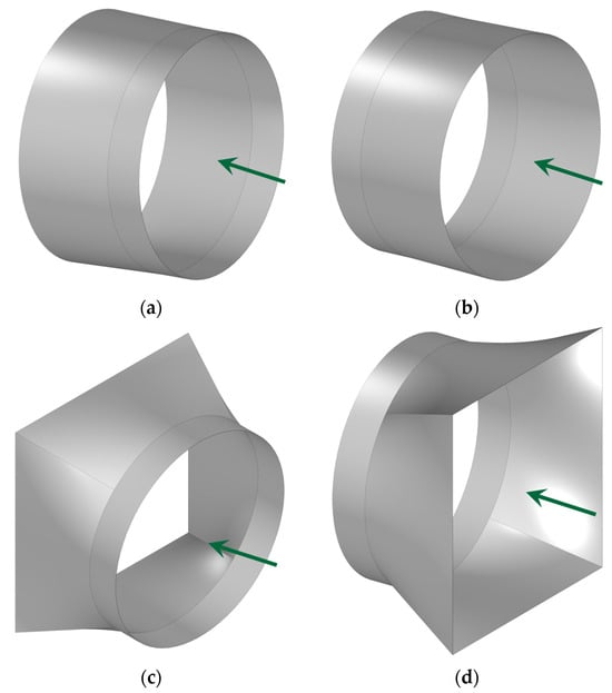 The geometry of the aerodynamic shield with: (a) increasing cross-sectional area (diffuser), circle to circle; (b) decreasing cross-sectional area (confusor), circle to circle; (c) increasing cross-sectional area (diffuser), square to circle; and (d) decreasing cross-sectional area (confusor), circle to square. The green arrow indicates the wind direction.