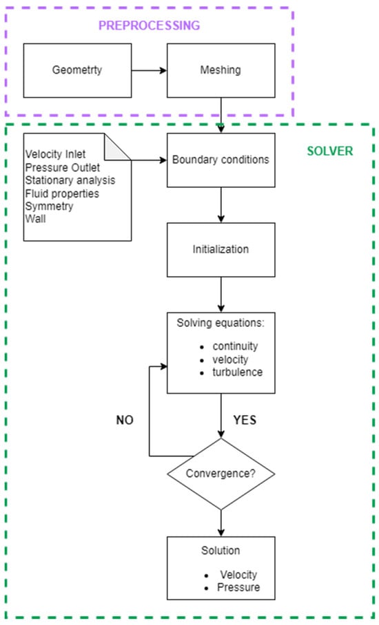 To perform numerical simulations, it is necessary to first prepare a computational model. The model set-up can be divided into three steps. The first step includes preparation of the geometry of the component under analysis and the surrounding environment. The next step is to generate mesh. The final step is the implementation of the required equations to perform calculations and analyze the results. Figure 5 presents the workflow for the simulation of the aforementioned problem, with all key steps highlighted.