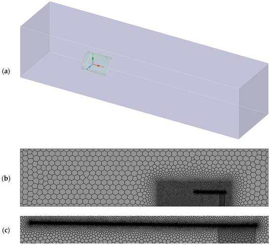 Computational domain: (a) geometry; (b) mesh—the entire computational domain; and (c) mesh—an increase in local mesh density around the wall of the aerodynamic shield.