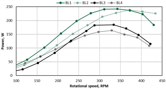 As the rotational speed increased, the power output increased for all of the tested wind turbines. Once the turning point was reached, the power output began to decrease. For almost all rotational speeds, the highest values of the power output P were obtained for the five-bladed wind turbine with the largest chord, labeled as BL1. The results obtained for the turbine composed of blade types BL3 or BL4 were very similar, especially for higher rotational speeds, and simultaneously lower than for the turbine composed of blades labeled BL2. The maximum power was achieved at around 350 RPM for all tested configurations. Comparing the values obtained for the individual turbines at this rotational speed, the BL2 turbine produced about 5% less power than the BL1 turbine, the BL3 turbine about 26%, and the BL4 turbine about 35% less power than the BL1 turbine. For a rotational speed of around 400 RPM, the wind turbine with blades labeled BL2 obtained slightly higher performance than the BL1 turbine. The wind turbine with blades BL2 generated approx. 8% higher power than BL1 at this rotational speed, while the BL3 wind turbine had approx. 35% and the BL4 turbine approx. 40% lower power than the five-blade BL1 wind turbine.