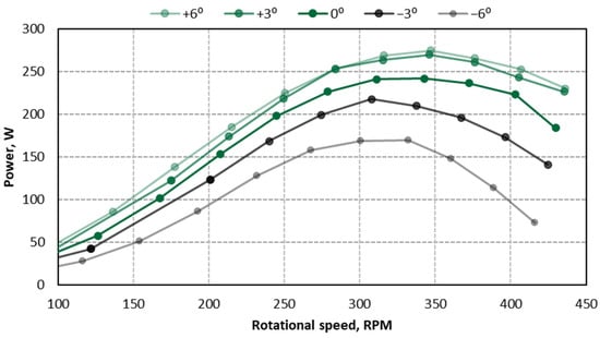 Based on the analysis presented above, to evaluate the effect of the blades’ inclination angle on the wind turbine power output, a turbine with five blades of the BL1 type was selected. Tests were carried out for no blade inclination (0°) and tilt angles of +3°; +6° (clockwise) as well as −3°, and −6° (counterclockwise), respectively. Figure 8 shows the wind turbine’s power output as a function of the turbine rotational speed for the tested inclination angles of the blades BL1.