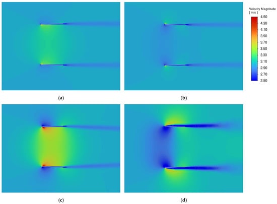 With numerical research, it is possible to develop a geometry of the aerodynamic shield and assess its ability to increase the average velocity in the rotor cross-sectional plane. As presented in the section describing the research methodology, the numerical analyses began with a comparison of different types of shields dedicated as accessories to wind turbines. In the first stage, the velocity distributions inside and around the aerodynamical shield were compared for four shapes of elements, i.e., two diffusers (circle–circle and circle–square) and two confusors (also circle–circle and circle–square). The results are presented in Figure 9, which contains the velocity distribution in the symmetry plane of the shield for each of the analyzed types of elements for the length L = 666 mm. All drawings were prepared for a common velocity scale.