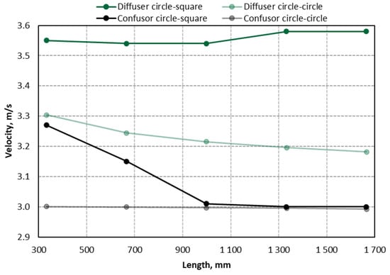 Velocity in a cross section as a function of the diffuser and confusor lengths in the circle-to-circle and circle-to-square configurations.
