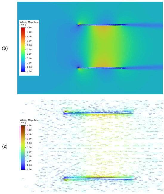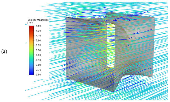 For the configuration labeled CD_4, the air velocity in the analyzed section was the highest. For the longest length of the confusor in the combined confusor and diffuser system, a 13% increase in velocity was obtained compared to the combined confusor and diffuser system with the smallest length of the confusor (CD_1). Lengthening the diffuser part of the combined set increased the velocity at the rotor cross-section. The highest increase in air velocity occurred when the lengths of the confusor and diffuser were the same. The results for configuration that allow for the highest velocity in the rotor section, i.e., CD_4, will be presented in detail below. Figure 14 shows the velocity distribution inside and around the aerodynamic shield CD_4. Figure 14a presents pathlines in the 3D view of the model. The velocity field and velocity vector distribution in the plane of the longitudinal section of the tested element are presented in Figure 14b and Figure 14c, respectively.