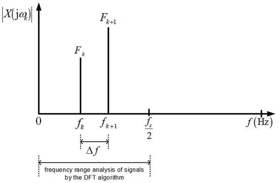The frequency resolution of the amplitude spectrum , obtained by the DFT algorithm from the sampled signal (see Figure 1), is given by Equation (2):