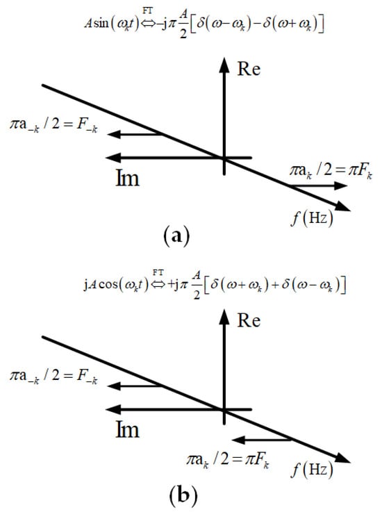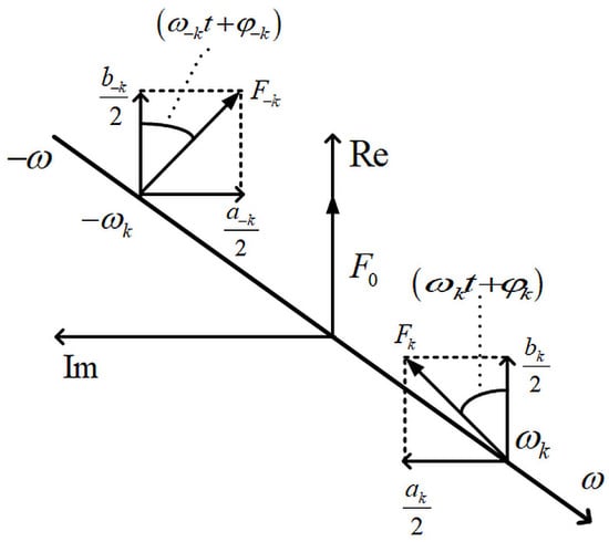 - Complex form of two counter-rotating vectors (i.e., phasors) and with the same angular velocity , half the magnitude , and initial phase and in the Cartesian coordinate system (Re, Im), where this system is rotated by (i.e., the real axis is vertical); the result of the vector sum of these two complex conjugate vectors is a vector in the direction of the real axis, representing a real number, expressing in our case the amplitude of the harmonic component at a given time (8) (see Figure 2):where , ; the coefficients and represent the k-th harmonic component of the two-sided (i.e., complex conjugate) complex spectrum, is the half amplitude of this component: