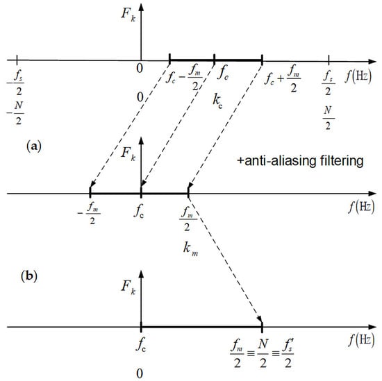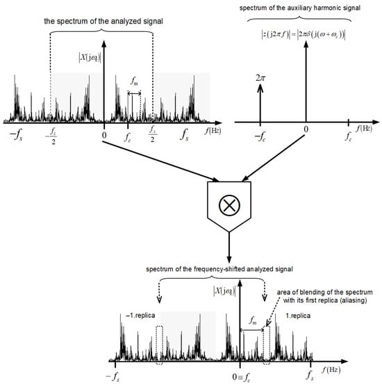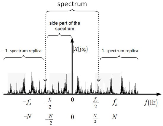Of course, this is not true for a general signal, and there is a shift between the spectral lines’ predetermined positions and the signal components’ actual frequencies. It all depends on the choice of record length T and the number of samples in this record. The discretization of the segment by sampling it with a sampling frequency assumes the creation of spectrum replicas with a period of . The spectrum of the sampled limited signal is the sum of an infinite number of replicas of the spectrum of the analog limited signal. It is related to the so-called aliasing and the Shannon sampling theorem [10,11,12,13,14,15,16].