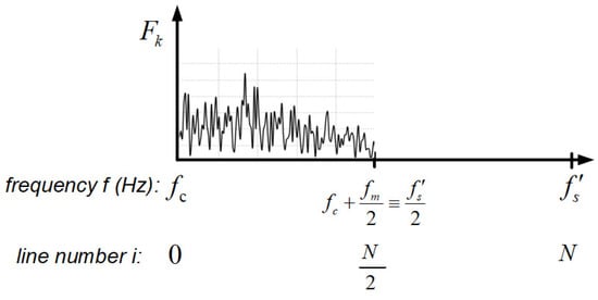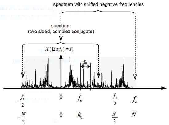 which includes negative frequencies , and its computation yields the original complex conjugate spectrum as shown in Figure 4. In industrial practice, negative frequencies on the frequency axis are transformed from the range to the range by shifting the index k by the value N. This corresponds to the modified form of the DFT (10):