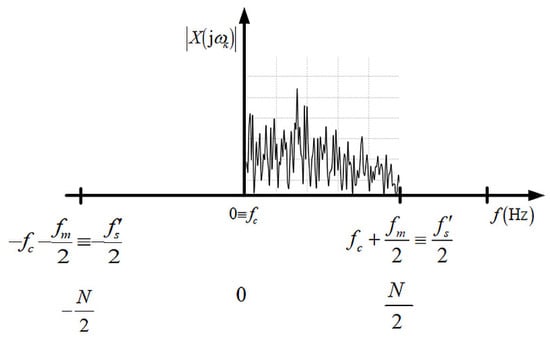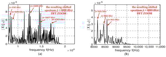 The basis for solving the frequency zoom is the two-sided line spectrum (see Figure 4), which results from the DFT algorithm applied to a signal record with a length of N samples [31,32,33,34,35]. The basic form of the DFT algorithm is given by Equation (9):