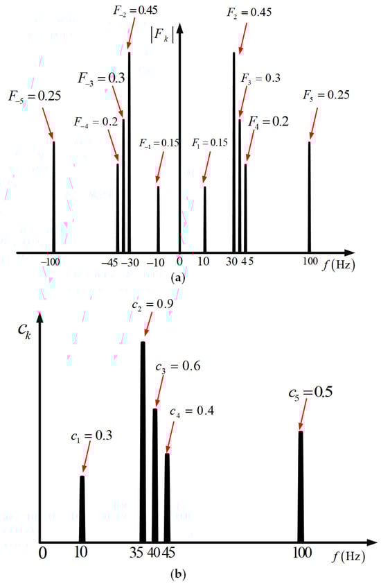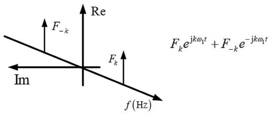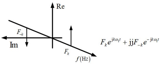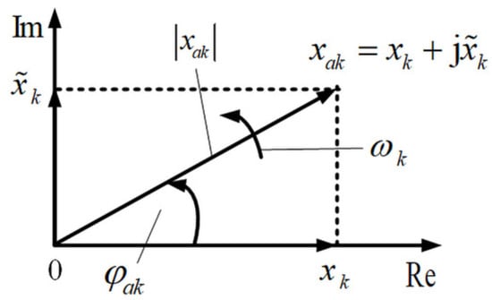 Every real signal can be replaced by the sum of harmonic signals of different frequencies and initial phases according to Fourier analysis, where the frequencies of these components are integer multiples of the fundamental frequency . If these harmonic components are expressed in complex form using two counter-rotating vectors (phasors) and with the same angular velocity , then for the k-th harmonic component of the signal it is possible to write (32):