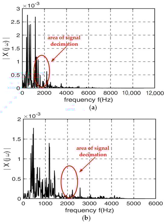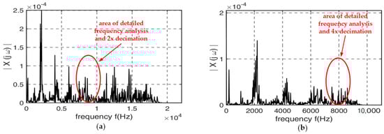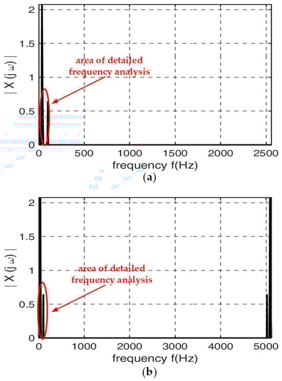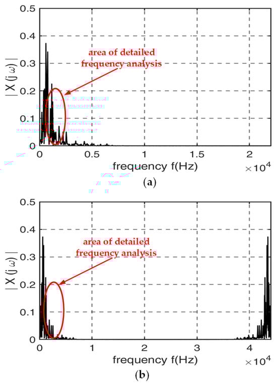 Equation (1) holds for a real signal limited by the highest frequency component and assumes its periodicity with a fundamental period of . For the first and fundamental frequency component in the spectrum and the frequency resolution in the spectrum, the following applies , where T is the duration of the analyzed real sensor signal (s). The signal duration T (s) depends on the number of samples N and the signal sampling frequency: . In Equation (1), the coefficient k is limited to the range from 0 to . According to the DFT algorithm, the number of spectrum lines must match the number of samples in the real signal record. The spectrum given by Equation (1) is complex, consisting of an amplitude spectrum and a phase spectrum. The number of spectral lines represented in the spectrum equals the number of N samples in the analyzed signal record. Due to the effect of aliasing and the symmetry of the discrete spectrum around the frequency axis, the usable part of the line spectrum extends only up to the so-called Nyquist frequency . The actual number of relevant lines in the complex discrete spectrum according to (1) is only ; the other spectral lines are redundant from an informational aspect.
