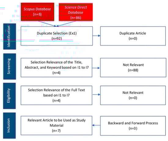 Figure 1 shows that 92 articles were selected in the search process based on the keywords listed in Table 2. At the identification stage, the results indicated that no duplicate articles were found. During the screening stage, 4 articles were identified that met the inclusion criteria I1 to I7. The results of the selection at the eligibility stage yielded four articles that could answer the research questions. The next step involved conducting backward and forward citation processes by tracing articles that cite or are cited by the four selected articles. The results of these processes produced three additional articles that met the inclusion criteria I1 to I7 and could answer the research questions. The summary of 95 articles that were selected during the identification stage, along with the backward and forward process, is presented in the Table S1. In total, seven articles were obtained from the selection process using the PRISMA method [,,,,,,]. The seven selected articles were able to answer the QR at the planning stage, so they were analyzed using biblimoetric analysis and manually by searching for the state-of-the-art based on research gaps and novelty.
