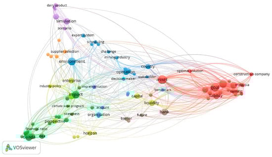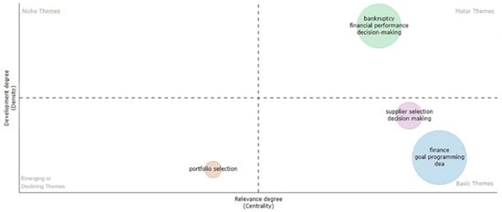 The thematic mapping using the R-bibliometrix 4.4.1 software, as shown in Figure 5, illustrates the distribution of topics within 95 articles across various quadrants and clusters. Each theme is plotted according to its level of relevance (horizontal axis) and degree of development (vertical axis), and they are categorized into four quadrants. The motor themes in the top right quadrant, such as bankruptcy, financial performance, and decision making, exhibit high relevance and strong development. These themes are the most prominent and display strong internal connections, playing a key role in advancing research during the period. In contrast, basic themes in the bottom right quadrant, like supplier selection, decision making, finance, goal programming, and data envelopment analysis (DEA), have high relevance but relatively lower development.