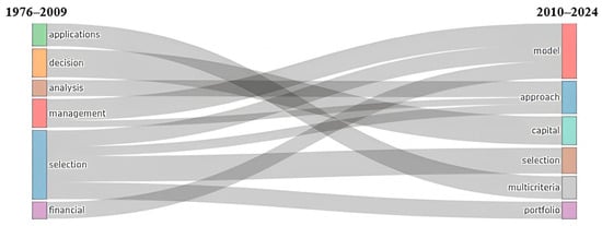 Figure 4 presents the evolution of themes in 95 articles. The thematic evolution is outlined across two distinct periods, namely 1976–2009 and 2010–2024. These divisions facilitate detailed observations of the changes and developments in the themes over the specified time intervals. This provides a comprehensive view of the dynamics of the main themes being explored in the literature. During the 1976–2009 period, one of the discussed themes was finance, which later evolved in the second period into a model. This evolution shows the relevance of the topic shifting from finance to mathematical models, which can be further explored in relation to these topics.