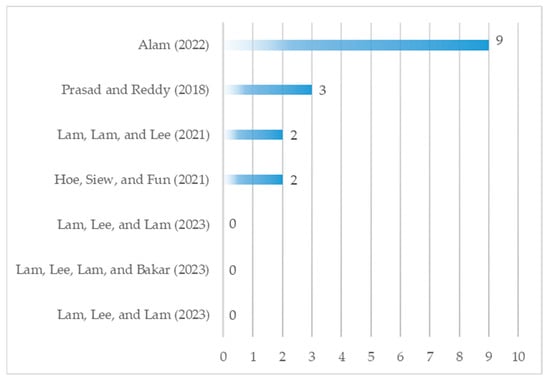 The number of citations from the seven selected articles is illustrated in Figure 7, which was created using Microsoft Excel 2019. The topic of GP in ALM for non-financial companies was first introduced in 2018 and has gained increasing attention, particularly in 2022. The results show that the article by Alam [] received the highest number of citations in 2022, with 9, followed by Prasad and Reddy [], who garnered 3 citations. The two other articles, namely Lam, Lam, and Lee [] and Hoe, Siew, and Fun [], each received 2 citations. Notably, three of the articles, namely Lam Lee, and Lam [], Lam, Lee, Lam, and Bakar [], and Lam, Lee, and Lam [], have yet to receive any citations, indicating that the application of GP in ALM is still not widely explored by other researchers.