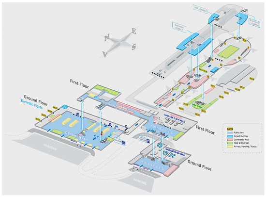 - International Air Transport Association (IATA). Available online: https://www.iata.org/contentassets/d1d4d535bf1c4ba695f43e9beff8294f/passenger-terminal-design.pdf (accessed on 22 April 2024).