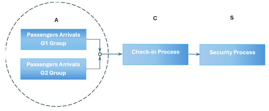 The model of passenger flows within the airport terminal was implemented in ARENA 12 simulation software. The simulation program follows the diagram of departing passengers for domestic flights described in Section 4.1. In ARENA 12, the passengers are defined as entities, while the check-in and security desks are defined as resources. The passengers are passing through different modules of the simulation model, representing the defining/changing characteristics of the passengers, decision blocks, and states of the resources. The logic model is structured in three sub-models: passenger’s arrivals (A), check-in (C), and security control (S) processes (Figure 4).