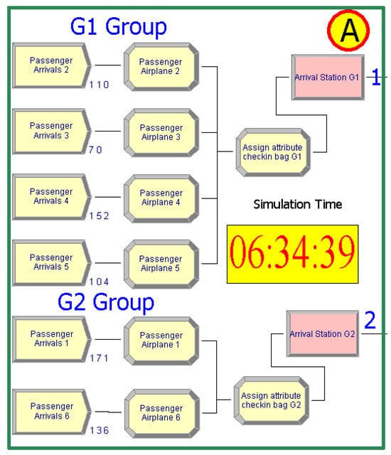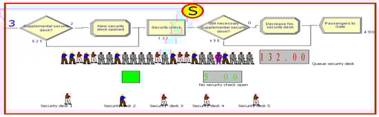 In the first sub-model (Figure 5), passengers are generated based on a time distribution between their arrivals within the module Passenger Arrivals. The passengers start arriving at the airport 2.5 h before the departure of the airplane. The moment of a passenger’s arrival at the airport is recorded to determine the time spent until the security check is finished.
