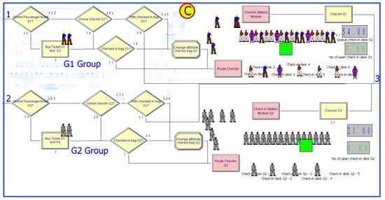A notable strength of the developed simulation model is its adaptability; it can be updated and modified to meet current requirements. This research involved studying passenger flows at Romania’s main airport and identifying the key components of the simulation model, including operational processes, resource utilization, and service discipline at workstations. The variability in passenger volume was instrumental in establishing input data, enabling the accurate representation of interactions between flows and operations in the area studied. Two scenarios were examined: Scenario 1 maintains a constant number of security and check-in desks for the two airline groups, while Scenario 2 allows for a flexible allocation of these desks. The results indicate that Scenario 2 shows significant improvements across nearly all performance metrics (the average number of passengers waiting, the average passenger waiting times, and utilization rate) compared to Scenario 1.