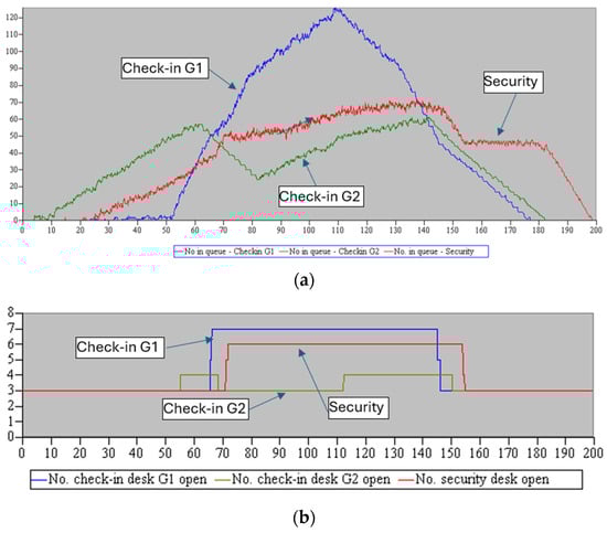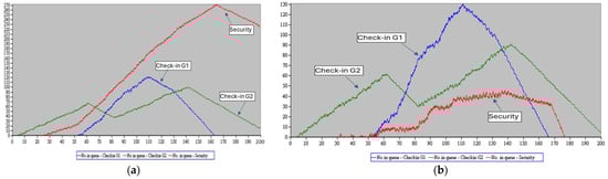 The evolution of the number of passengers in queues with six check-in desks for group G1, three check-in desks for group G2, and three security desks (6G1-3G2-3S) is depicted in Figure 8a. At the end of the simulation time, there are more than 200 passengers waiting for security processing, so more open security desks are necessary. As shown in Figure 8b, if two more security desks are open, then no more passengers will wait in the security queue, but there will still be some in the check-in queue in the G1 airline group (green line).