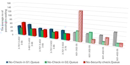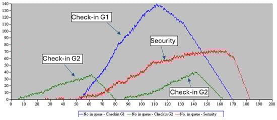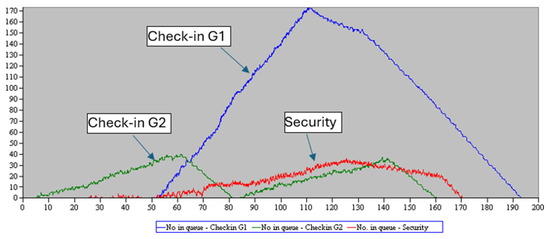 Adding one more check-in desk for the G1 airline group leads to the dissipation of all queues, as shown in Figure 9.
