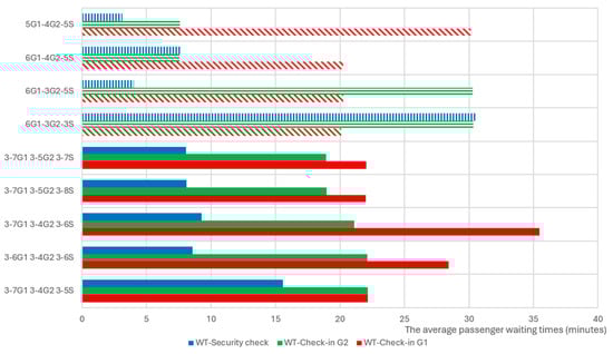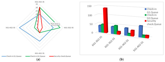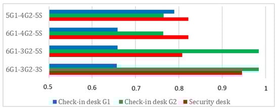The simulation 6G1-4G2-5S gives minimum check-in and security waiting times, but the utilization rate of the terminal resources (desks) is lower than the case with five security desks and between six and four check-in desks for the G1 and G2 airline groups (simulation 5G1-4G2-5S), as shown in Figure 12.