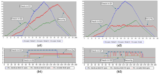 In this scenario, we added or reduced the number of available check-in and security desks depending on whether they exceeded the threshold of the desk queue length, as mentioned in Table 3. As depicted in Figure 13(a1), the simulation 3-7G1 3-4G2 3-5S described as having from three to seven desks for check-in group airlines G1, from three to four desks for check-in group airlines G2, and from three to five desks for security procedures conducts to non-zero queue length at security desks at the end of the simulation run. To avoid this, we increased by one the number of available security desks and decreased by one the available check-in G1 desks, but, as shown in Figure 13(a2), this configuration 3-6G1 3-4G2 3-6S does not improve the final security queue, but just reduces the peak of this queue from an average of 71 passengers to 37. Also, we can observe in Figure 13(b1,b2) the variation in desk numbers for the above-mentioned simulations.