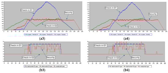 As depicted in Figure 15(a3,a4), the queue length evolution of check-in and security desks are similar, but the rate utilization of security desks is better in configuration (3) according to Figure 15(b3,b4) and Figure 16.