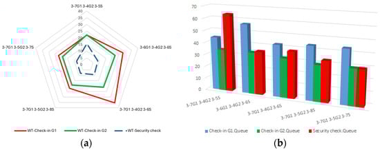 Figure 11 summarizes the results obtained in the different simulations in terms of minimizing the waiting times (a) or the number of passengers waiting (b) during the different processes within the airport terminal.