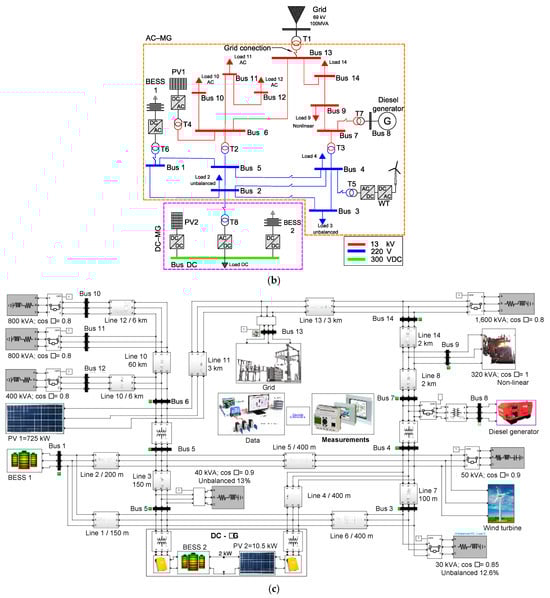 - A fully detailed 14-bus μG system operating in grid-connected mode for power quality studies has been designed and modeled. Within this μG, various DGUs, including solar and wind power sources, as well as both balanced and unbalanced loads (comprising linear and non-linear loads), BESSs, power transformers, and distribution lines, have been considered. It is worth mentioning that the proposed μG model is a variation of the original IEEE 14-bus model and that no previous study has analyzed the impact of wind generation on μGs. The details of this impact are discussed in Section 5.