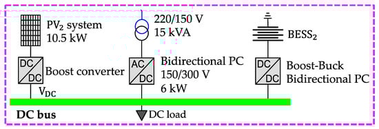 - DC-μG: Highlighted by a magenta dotted line, this segment contains a DC bus featuring 960 W and 3.5 MJ BESS2 and a 10.5 kW PV system. It is connected to the AC-μG through two bidirectional, parallel PCs, enabling the transfer of active and reactive power via transformers.