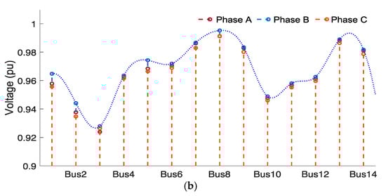 | Voltage profile | Authors do not analyze it | Authors do not analyze it | Lower voltage profiles (in pu) at Bus 10 = 0.9486, bus 11 = 0.9478 and bus 12 = 0.9476. | Voltages on each bus are in the acceptable fluctuation range (0.95–1.05 pu) | Voltage in phase L1 = 226.4, 2.6% above nominal value | Notable voltage sags are observed in the LV grid at buses 2 (0.942), 3 (0.939), and 10 (0.946) |
