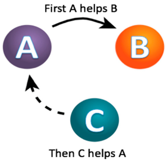 Alexander shows that the essence of moral systems is in patterns of indirect reciprocity [22,23]. He establishes that indirect reciprocity (“I help you and someone else will help me later”) based on reputation is what occurs when direct reciprocity (“I help you and you help me”) occurs in the presence of an interested audience in cooperative interactions (see Figure 1). In the indirect reciprocity mechanism, the probability of the same two individuals interacting again is low. However, in the direct reciprocity, there are repeated encounters between the same individuals.
