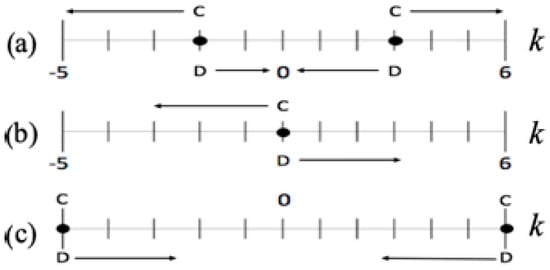 In the IIRMMD model, we define the individualism criterion as the act in which an agent “strengthens” his k-profile based on their past earnings interactions (if you help me, I have a “good” profile, so I strengthen it; otherwise, I attenuate it changing to the opposite profile). This individualism simulation idea is aligned with Sullivan and Haklay’s ABM simulation conception [30]. In Figure 2, each mark represents a potential situation of k-profile for any agent. If the agent is cooperative and someone cooperates with him, he will increase his cooperative profile, moving left; otherwise, he moves to the right. Similarly, if he is a defector and someone cooperates with him, his profile will increase, moving to the right; otherwise, he moves to the left (Figure 2a). When the agent is a discriminator, he becomes a cooperator if someone cooperates with him and defectors if not (Figure 2b). If an agent has profile , he will keep his profile if someone cooperates with him; otherwise, he will move to the right (Figure 2c), similar to .