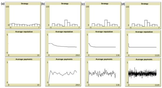 Temporal evolution (a) , and (d) . Only these values of t are shown because, after 100, the graphs present almost identical behavior. Histograms show the agents proportions of k-profile values. The other two monitors are the average of reputation and payments showing the temporal evolution. The software places the bar up to the right of each number in the histograms; it shows the lower and upper limits of histogram values. Also, it displays slightly more on the x-axis, and the parameter mark is how far the curve goes for the average reputation and payment graphs.