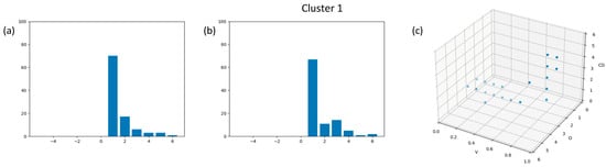 Cluster 1: (20 histograms) (a) or (b) This cluster has a significant proportion of agents at bin 1, 75% of whole agents. The rest are in bins 2 to 6. (c) In the parameter space 3D view, the parameter that displays the grouping for this cluster is obstinacy () since they are clustered in values 2 and 3. There are two groups in the visibility parameter (); the first is in the lower part of the grouping of points, which has values ranging from 0 to 0.4 and the second at 0.6. The cooperation demand parameter () shows two groups, one with 0 and the other where the points are agglomerated between 3 and 5.
