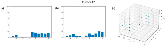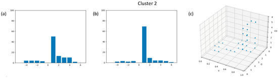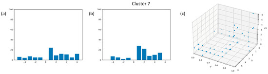 Cluster 7: (50 histograms) (a) or (b) This cluster has frequency histograms represented with values ranging from −5 to −1 and from 1 to 6. (c) In the parameter space, two groupings can be identified. The first group has an obstinacy parameter ranging from 4 to 5; the cooperation demand value is 0; visibility ranges from 0 to 0.6. In the second group, the obstinacy value is 0, cooperation demand is between 0 and 2, and visibility is mostly between 0 and 0.8.