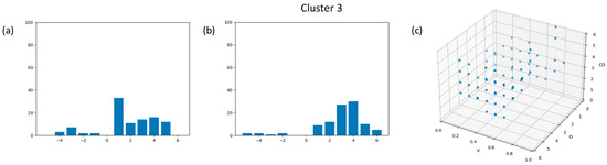 Cluster 3: (74 histograms) (a) or (b) The histograms representing this cluster have two parts; one part is in bins from −4 to −1 and one which is more representative and has values in bins ranging from 1 to 5. (c) There are two groups in which obstinacy is the most relevant parameter in the parameter space. Points in the first group are located from 2 to 4 values, and the second group is at a value of 0. The parameter of visibility’s values ranges from 0 to 0.6, and the cooperation demand parameter is distributed from 0 to 4.
