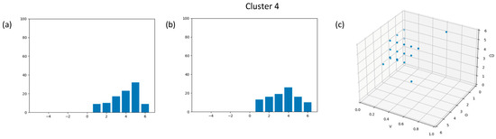 Cluster 4: (20 histograms) (a) or (b) The histograms’ proportions of this cluster are in bins from 1 to 6. (c) Obstinacy is the most characteristic parameter, with most values being 2, visibility has values from 0 to 0.2, and cooperation demand has values 3 and 4.
