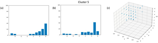 Cluster 5: (36 histograms) (a) or (b) The histograms representing this cluster have proportions skewed to the right; this cluster has two frequency groups, one with bin values of −5 and −4 and the other with bin values from 1 to 6. (c) In the characteristics space, visibility and obstinacy values are the most representative; the visibility values’ range is from 0 to 0.5, while obstinacy has two parts, the first one has values of 3 to 4, and the second has a value of 0. The cooperation demand parameter has values ranging from 4 to 6.