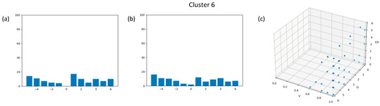 Cluster 6: (40 histograms) (a) or (b) There is a heterogeneity proportion of k values in this cluster, ranging from −5 to 6. (c) In the parameter space, the most representative attributes are in the visibility and obstinacy parameters; the visibility parameter axis has values between 0.8 and 1. Obstinacy values are mostly between 5 and 6.