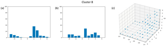 Cluster 8: (96 histograms) (a) or (b) The histograms representing this cluster have two proportions. The left part is in the bins from −5 to −2 and the right between 1 to 6, which have more profusion. (c) Visibility is the most relevant parameter in the parameter space, with values ranging from 0.8 to 1. Obstinacy and cooperation demand have all value types, but no outstanding groupings exist.
