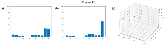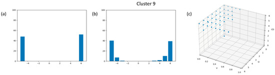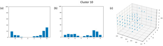 Cluster 10: (60 histograms) (a) or (b) This cluster is represented with histograms where there are frequencies on both sides, with a greater quantity on the right side and a tendency to the extremes, bins −5 and 6. (c) In the parameter space, obstinacy has two groups: the first one with a value of 1 and the other with values of 5 and 6. The cooperation demand parameter has values between 3 and 5, and the visibility ranges from 0 to 0.8.