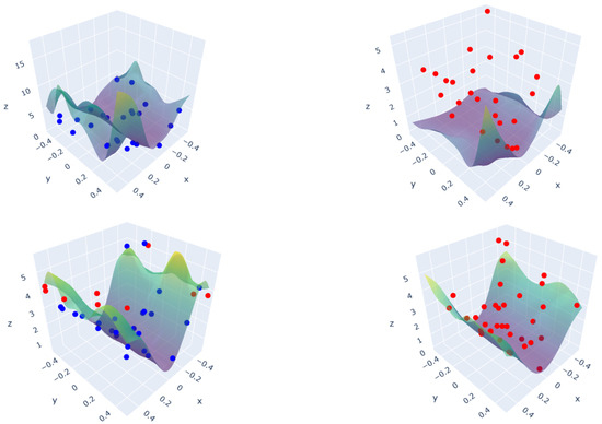 The value d will be used as our new information criterion in the active learning process. As it is an equivalent of the variance, we will seek the point with the highest value of d. Then, we calculate its corresponding output, , to add the point to the training database.