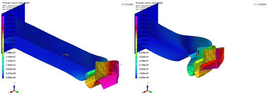 The application of the stress smashes the beam along the y-axis. The corresponding deformation depends on the thickness chosen for the three boxes. Some cases are represented in Figure 7. The first, intermediate, and last time steps for different input values of thicknesses for the three parts are illustrated.