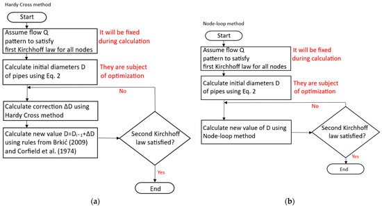 Figure 1. Differences between approaches of the two proposed loop-oriented methods for optimisation: (a) diameter correction D = Di−1 + ΔD, Hardy Cross method—Brkić (2009) [5] and Corfield et al. [7]; (b) direct calculation of D, node-loop method.- Hardy Cross method with the correction of the diameter ΔD in each iteration: D = Di−1 + ΔD; see Figure 1a and Section 2.3.1 of this article.