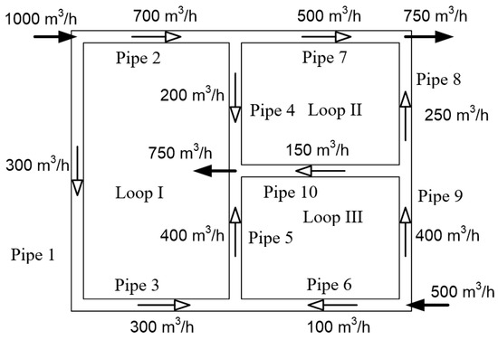 Distribution networks are a critical part of the infrastructure that delivers natural gas to households; their design and maintenance play a crucial role in ensuring a consistent and reliable supply of this energy source. Networks of pipes with loops are commonly used in urban areas to deliver natural gas to a large number of customers efficiently and reliably. The design and operation of such distribution networks typically involve the determination of routes for the delivery of gas, pipe sizing, pressure regulation, gas flow, etc., to meet demands, while ensuring safety and efficiency [1,2]. A gas distribution network with loops is a system of interconnected pipes with closed branches that are used to distribute natural gas to various consumers or endpoints, such as homes, businesses, and industrial facilities. The term “pipes with loops” indicates that the network is designed in such a way that it forms closed paths of interconnected circuits, rather than a simple linear configuration in the form of branches. Loops provide multiple paths for the gas to flow, ensuring flexibility in the distribution system. This can be advantageous for reliability and fault tolerance. If one section of the network experiences a problem or needs maintenance, gas is rerouted through alternative paths to minimise disruptions for consumers. However, the computation of the parameters of such networks can be challenging due to the nonlinear relationships among the flow rates, pressures, and pipe diameters. Due to the nonlinearity and mutual dependence of the parameters in looped networks, their computation involves iterative calculus. Such calculations are typically based on the Hardy Cross technique of analysing and solving flow distribution problems in pipe networks with various versions and improvements [3,4,5,6,7] (it is based on the analysis of continuous frames in statically indeterminate structures where the number of unknown reactions exceeds the number of available equilibrium equations [8,9,10]).